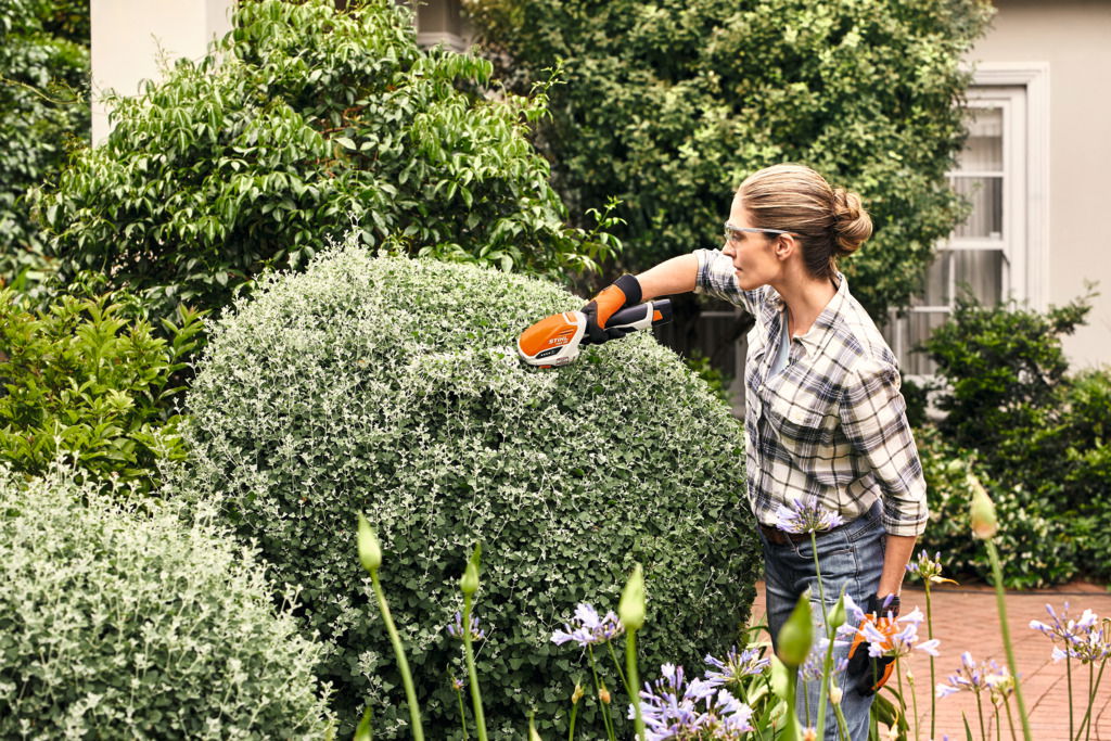 Cortacercos a batería ligero y compacto con cortador de cercos para podar y mantener cercos más pequeños, siempre verdes y árboles ornamentales de hoja pequeña. Cortador de cercos con geometría de cortador STIHL optimizada para una experiencia de corte óptima. Con cortadora de césped, incluso para cortar bordes de césped. Mango de control antideslizante para una ergonomía perfecta, cambio de hoja rápido y sin herramientas e indicador del nivel de carga de la batería para que pueda controlar la capacidad restante de la batería en todo momento. La batería AS 2 funciona exclusivamente con los productos del sistema AS.