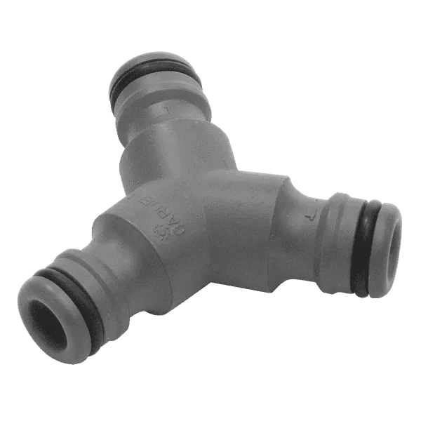 Adaptador especial para la unión rápida de 2 tramos de manguera, a otro tramo inicial obteniendo una bifurcación. Para pasar de mangueras de 19 mm (3/4") a mangueras de 13 mm (1/2") o de 15 mm (5/8").