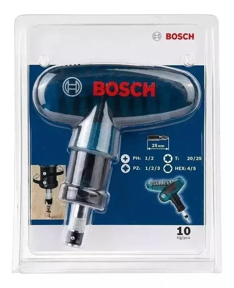_ Juego set de puntas atornillador manual 10 piezas Bosch multi-propósitos diseñadas para distintos tipos de uso en los diferentes materiales aptos para utilizarlas.