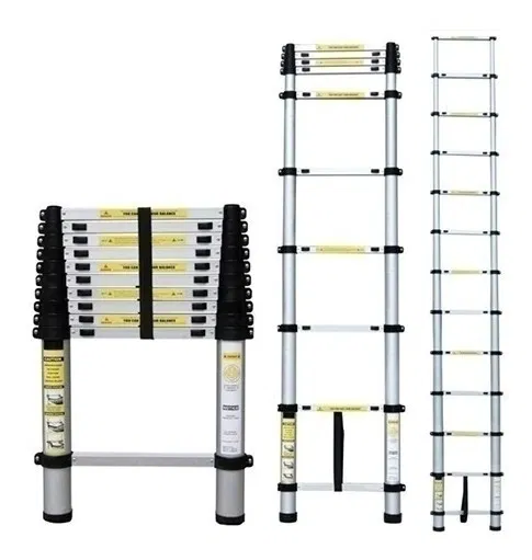 Escalera telescópica 11 Escalones Cantidad de escalones: 11 Largo extendida: 3.2 m Tamaño plegada: 10x50x90cm Soporta: 150 Kg Material: Aluminio Peso: 10 Kg