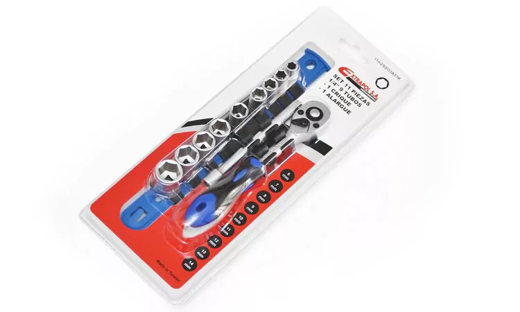 Juego Profesional de Tubos con Accesorios Encastre 1/4" con 11 PiezasLlave crique de 1/4" x 145 mm9 Tubos Hexagonales de 6 - 7 - 8 - 9 - 10 - 11 - 12 - 13 y 14 mmAlargue de 1/4" x 100 mmSujetador Plástico de Herramientas para Tablero