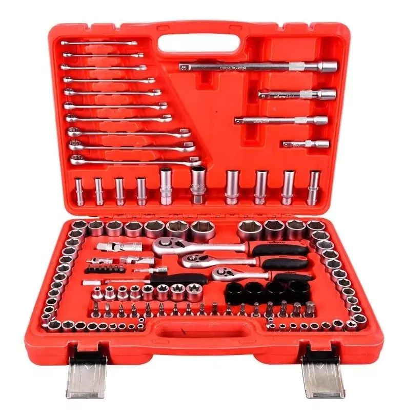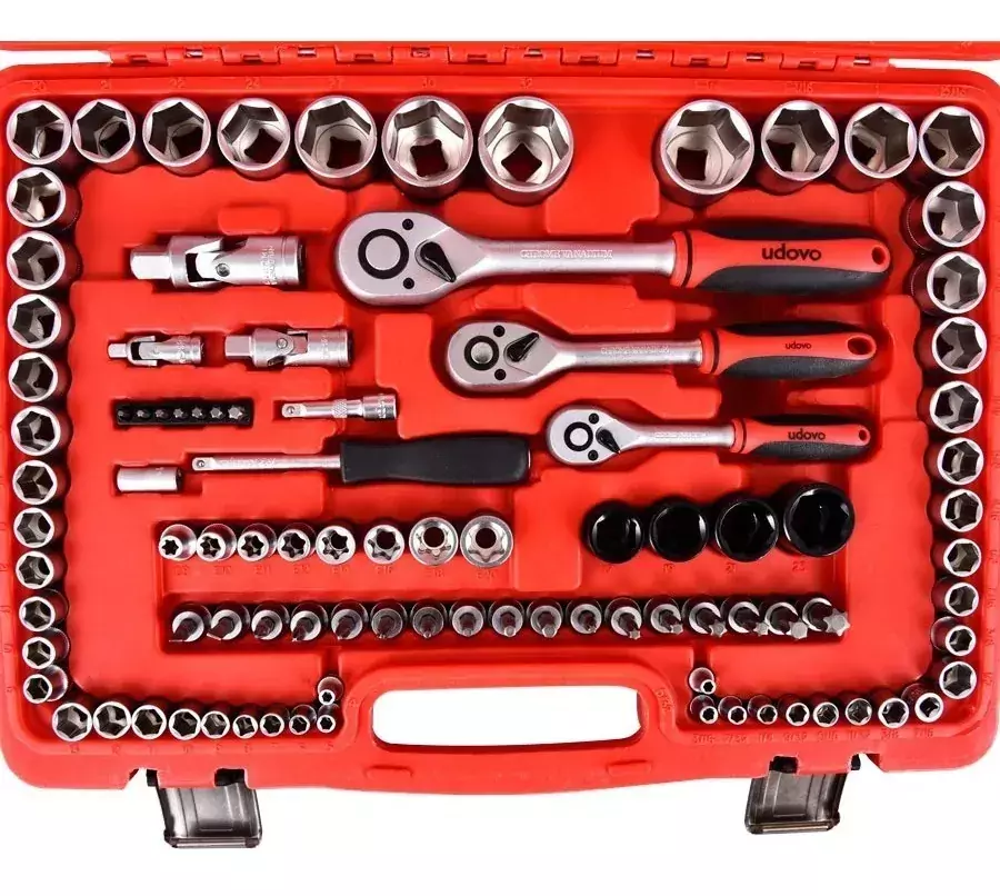 Tubos en pulgadas para encastres de 1/2 ”, 3/8 ” y 1/4 ” - tubos métricos para encastres de 1/2 ”, 3/8 ” y 1/4 ” - criques con expulsor para encastres de 1/2 ”, 3/8 ” y 1/4 ” - 10 llaves combinadas - 2 barras de extensión de 1/2 " - 2 barras de extensión de 1/4 ” - 1 barra de extensión de 3/8 " - 3 juntas universales - 1 destornillador con encastre 3/8 " y adaptador -tubos largos de 8 a 17 mm - 2 llaves saca bujías - 17 tubos con puntas: Torx, Allen, Plano, Phillips, Pozidrive - 4 tubos de impacto