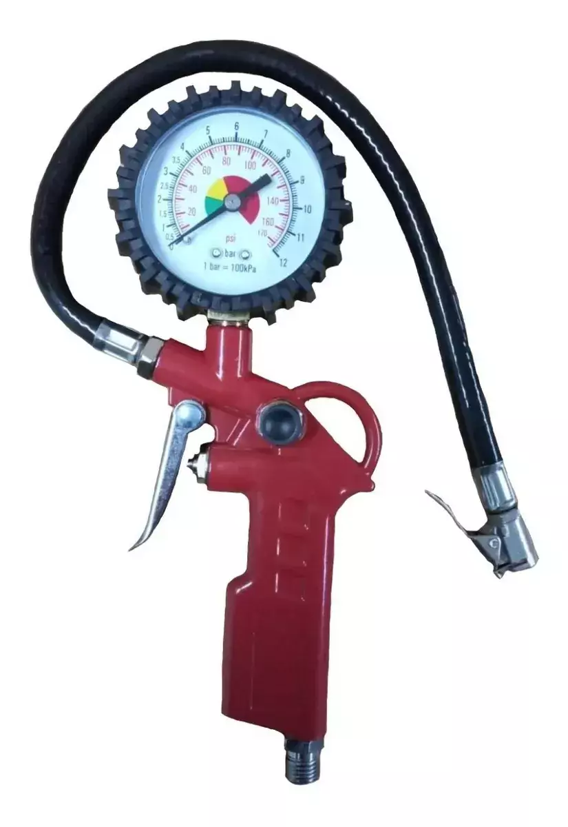 Medidor e inflador de aire para cámaras y cubiertas. Con cubre reloj de goma. Presión máxima 180psi/bar Pico tipo michelin con traba. Marca Kitana Conector rosca macho de 1/4 Con boton aliviador de presión.