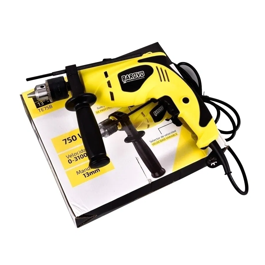 Características Técnicas: Marca: Barovo Modelo: TE75B Tipo: Eléctrico Alimentación: 220 V | 50 Hz Potencia: 750 Watts Velocidad: 3100 RPM Mandril: 13mm Selector de velocidad Guía plástica de profundidad