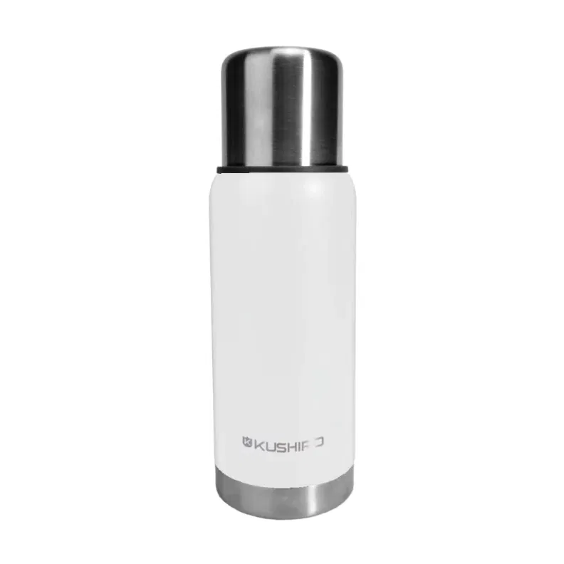 Termo Kushiro 750 ml blanco Capacidad: 750 ml Aislamiento al vacío Doble pared de acero inoxidable AISI 304 Espesor interno 0,4 mm Espesor externo 0,5 mm Tapón cebador Revestimiento con acabado mate Apto agua fría y caliente