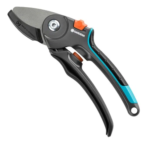 Las Tijeras de Jardín de yunque de GARDENA, con una cuchilla superior con capa antiadherente son perfectas para el corte de ramas secas y duras. El muelle está integrado en las tijeras de manera que no se pierde ni se ensucia. Mango ergonómico con componentes blandos adicionales aportan máximo confort al cortar. Las tijeras disponen de un gatillo de seguridad muy práctico para un almacenamiento seguro.